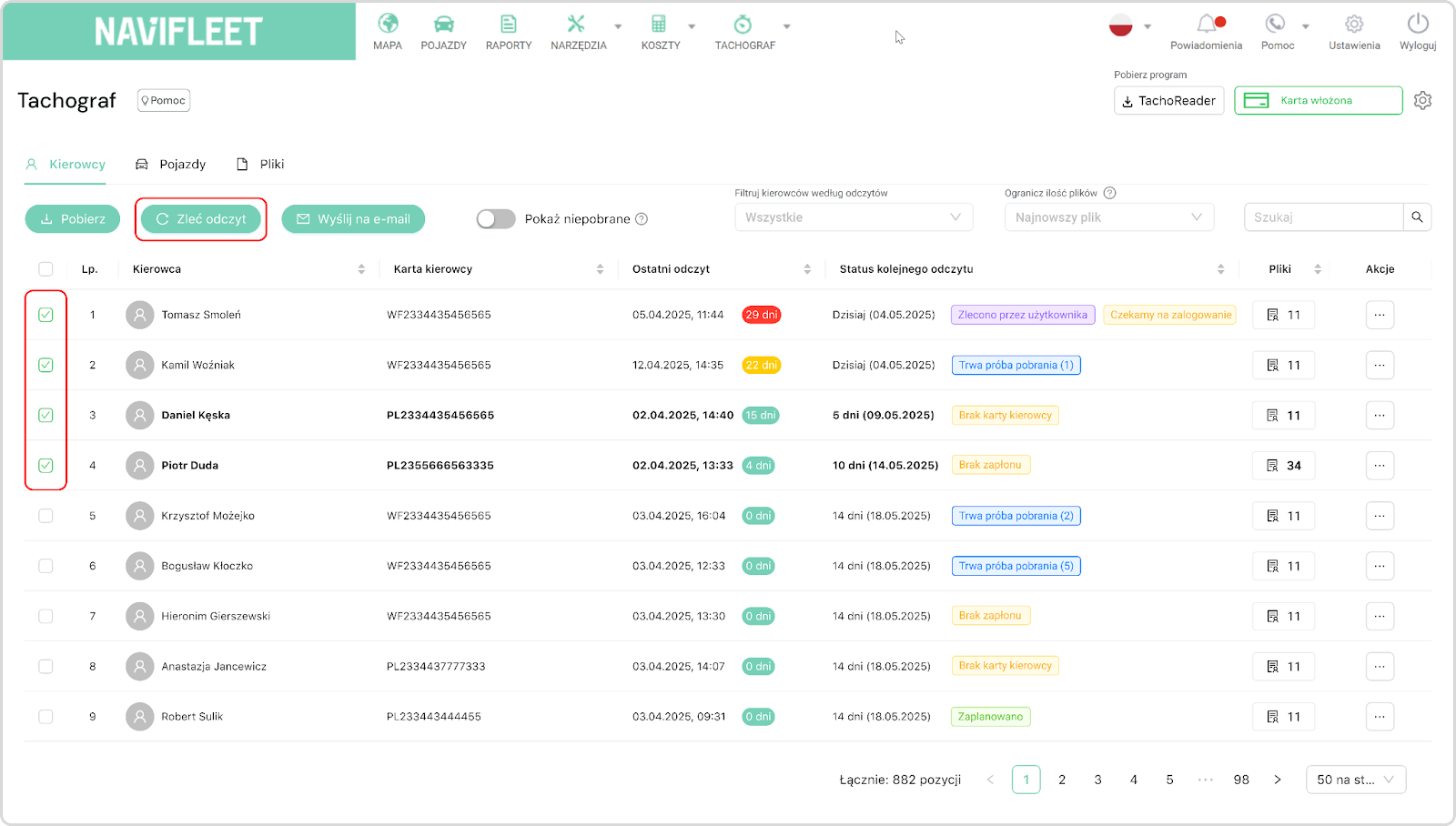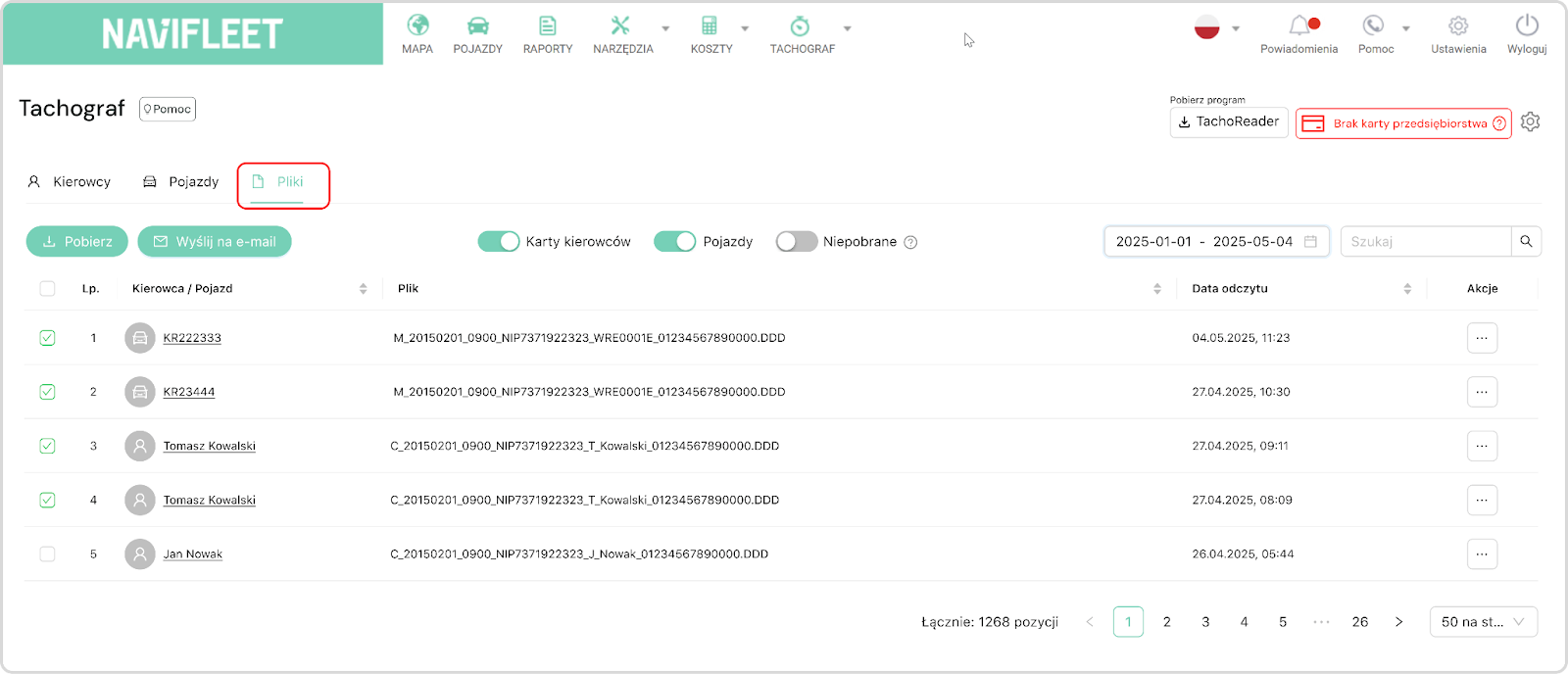 Oprócz standardowego zlecania odczytów z poziomu list kierowców i pojazdów, możesz także zarządzać wszystkimi plikami i danymi w zakładce Pliki, gdzie znajdują się również dane kierowców, którzy zostali usunięci z systemu, ale których pliki są wciąż dostępne i mogą być pobierane lub wysyłane.