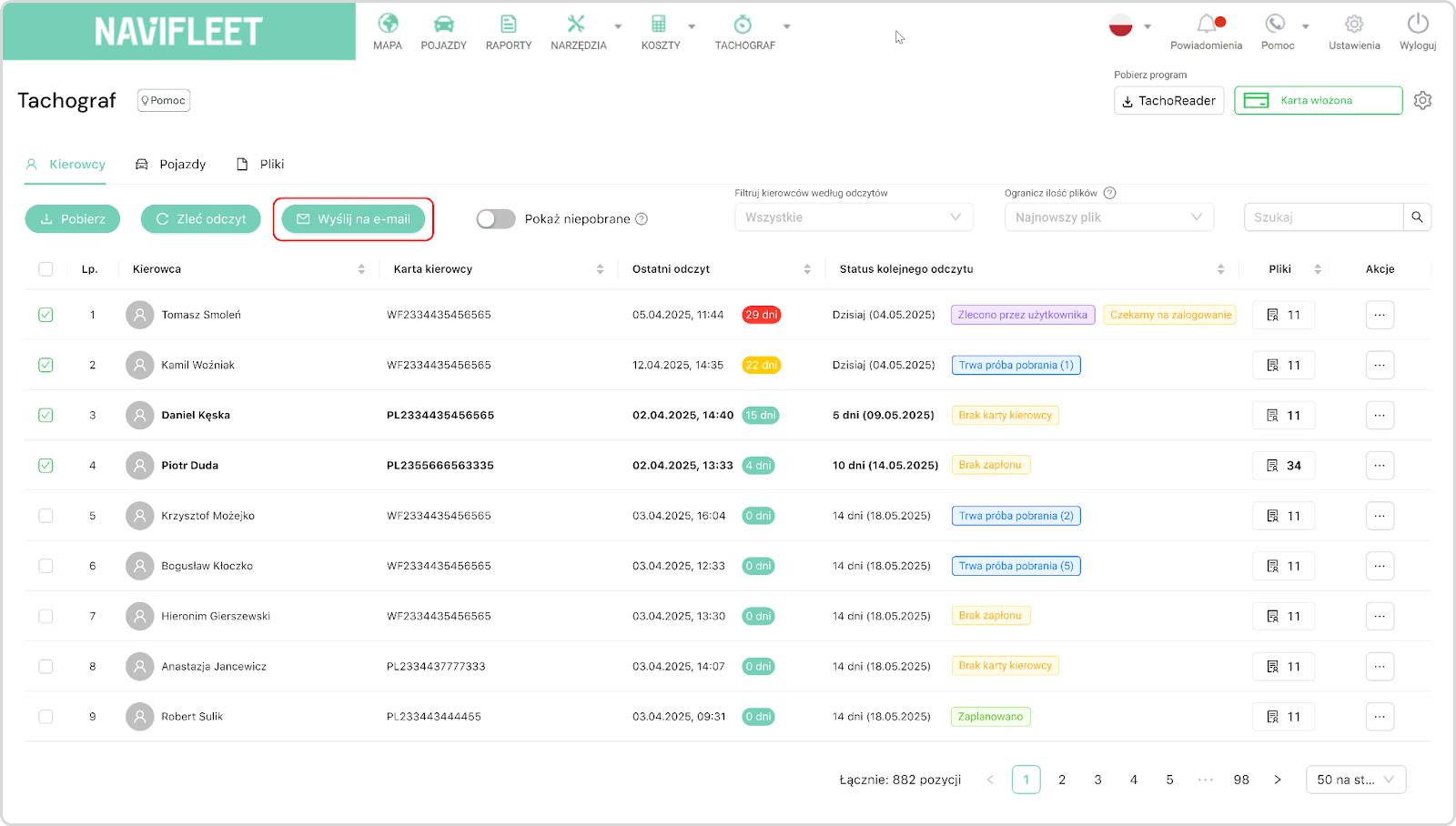 Pobrane pliki są automatycznie przypisywane do odpowiedniego kierowcy lub pojazdu i z przechowywane na serwerze. Możesz je pobrać w każdej chwili. Aby przesłać je e-mailem (np. do biura rozliczeń), kliknij Wyślij na e-mail i wpisz docelowy adres.