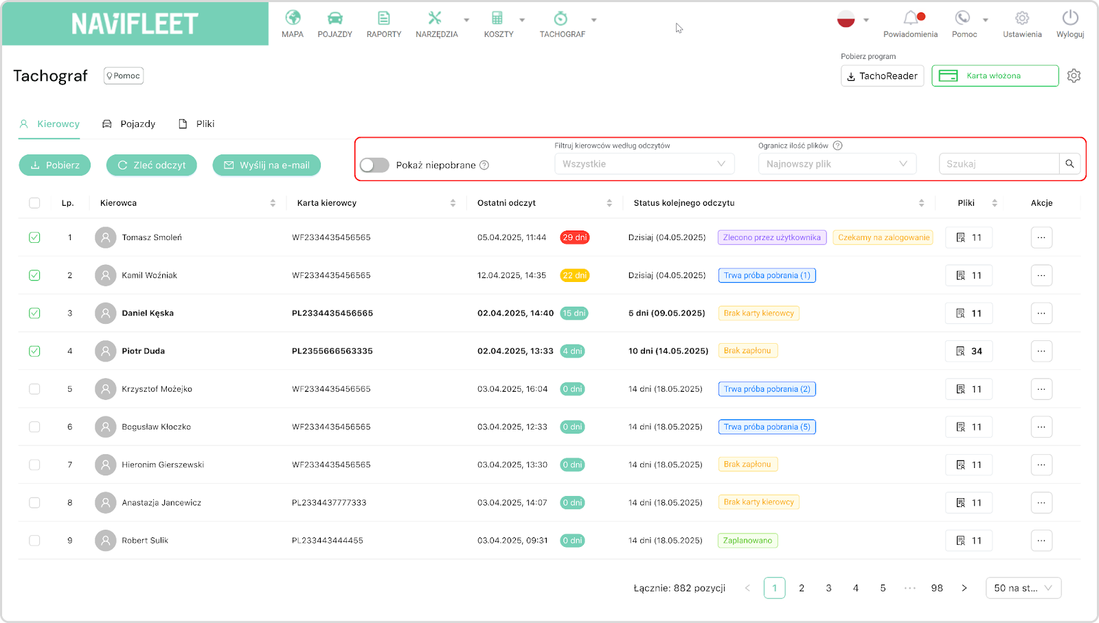 Aby szybciej dotrzeć do potrzebnych informacji, możesz użyć filtrów dostępnych w górnej części listy kierowców lub pojazdów. Dzięki nim łatwo zawęzisz widok do konkretnych przypadków - takich jak pobrania w bieżącym miesiącu czy brak odczytów.