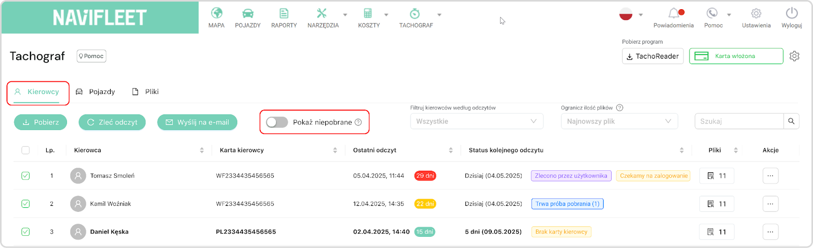 Opcja Pokaż niepobrane umożliwia szybkie wybranie kierowców lub pojazdów, dla których pojawiły się nowe pliki do pobrania od czasu ostatniego odczytu. Dzięki temu możesz jednym kliknięciem ograniczyć listę do tylko tych jednostek, dla których system zarejestrował nowe dane.
