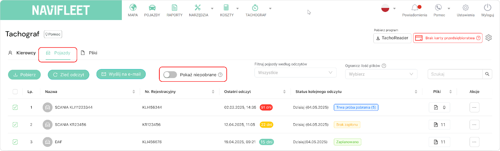 Zdjęcie 6. Widok funkcji Pokaż niepobrane w zakładce Pojazdy modułu Tachograf.