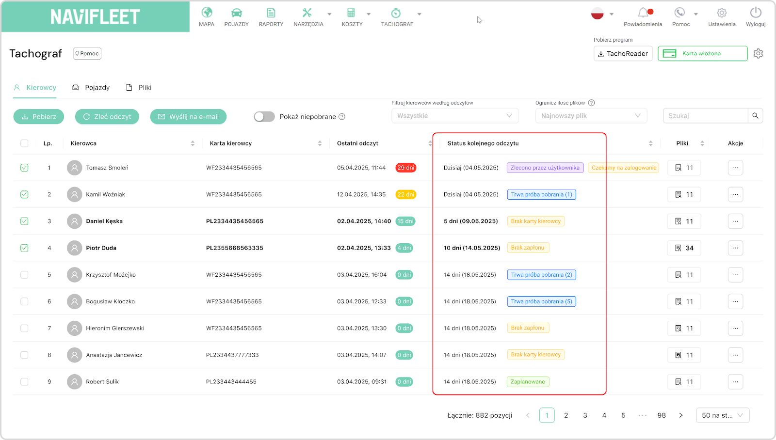 Zdjęcie 8. Widok kolumny Status odczytu w zakładce Kierowcy modułu Tachograf.