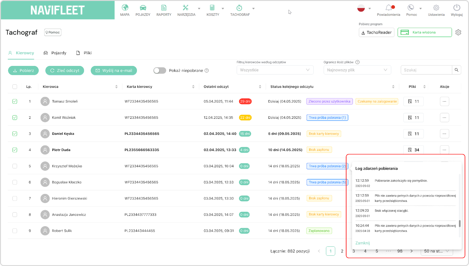 Jeśli pobranie danych nie jest możliwe, system wyświetla informację o przyczynie braku plików (np. brak karty kierowcy, brak zapłonu), dzięki czemu użytkownik wie, dlaczego dane nie zostały jeszcze pobrane. W systemie dostępne są również logi pobierania, umożliwiające szczegółową weryfikację prób odczytu.