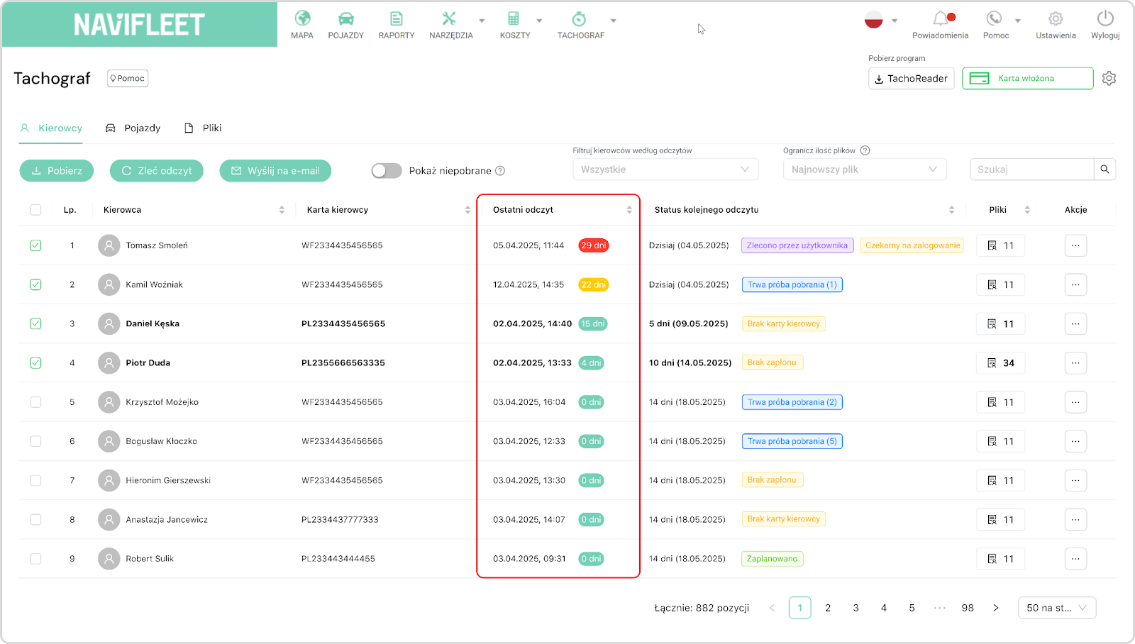 - Przekroczone 28 dni – pokazuje kierowców, od których ostatnie dane pobrano ponad 28 dni temu. Choć limit prawny na odczyt danych może być dłuższy, ten uproszczony filtr pozwala szybko zidentyfikować potencjalne braki.